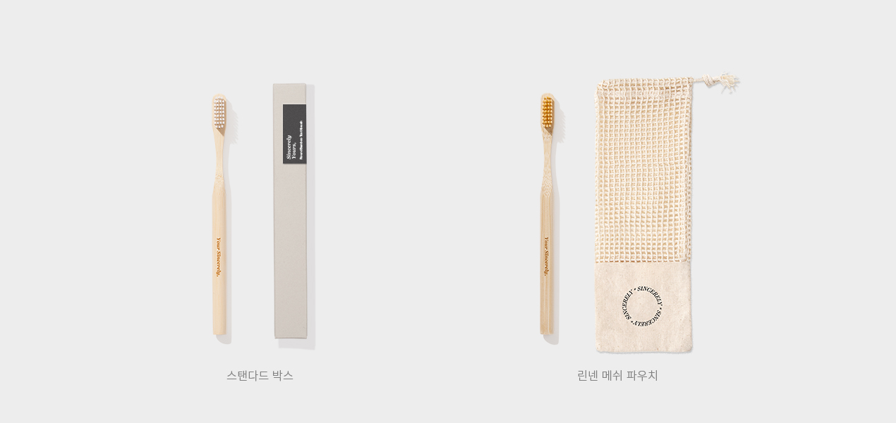 - 화이트, 브라운, 차콜 중 한 가지 색상의 칫솔모를 선택하여 선물해보세요. 성인이 사용하기 적당한 크기로 신시어리의 리프레쉬 고체치약과 함께 선물하면 더욱 매력적인 굿즈입니다.