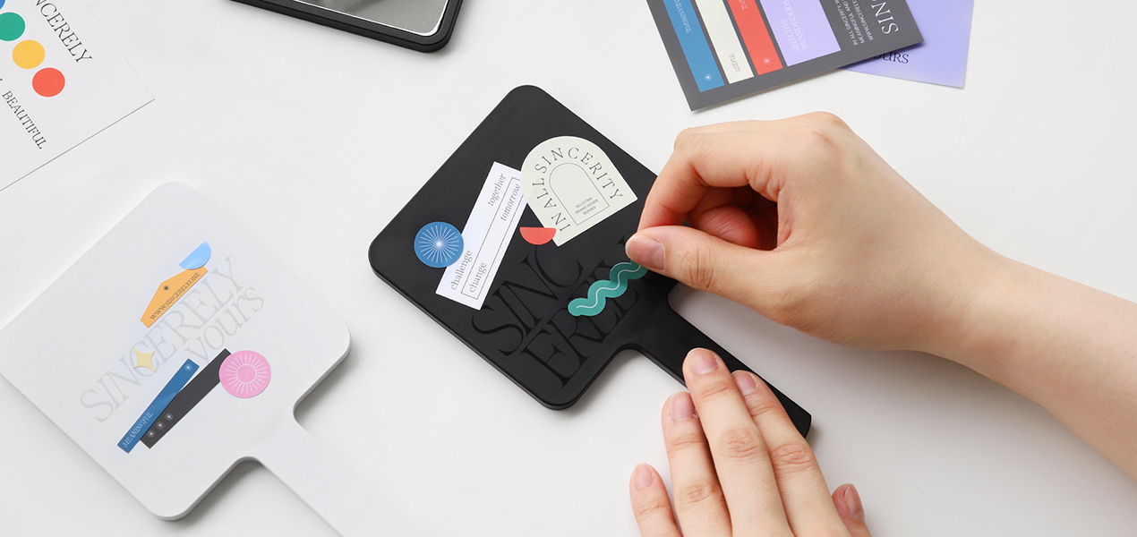 브랜드 로고를 인쇄한 손거울에 꾸미기 좋은 데코 스티커를 함께 선물해보세요. 외출을 준비하거나 사무실에서 잠깐씩 거울을 볼 때마다 브랜드 그래픽으로 가득 찬 뒷면에 자연스럽게 눈이 갑니다.