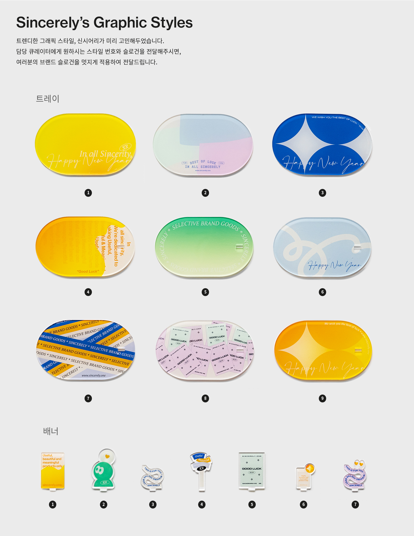 신시어리의 그래픽 리소스를 참고하여 트레이에는 로고를, 배너에는 캐릭터 혹은 슬로건을 인쇄해보세요. 1년 내내 받는 분의 공간을 아름답게 채우는 굿즈가 완성됩니다.