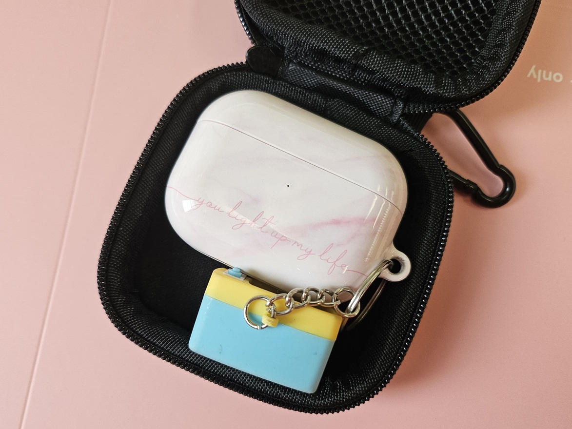 - 에어팟은 아무래도 가격대가 나가니 미니 파우치에 넣어 안전하게 보관하면 좋겠지요. 특히 제 에어팟에는 누르면 소리가 나는 키링이 달려있어서, 가방 속에서 멋대로 눌리면 민망하곤 했는데 이젠 그럴 걱정이 없습니다.