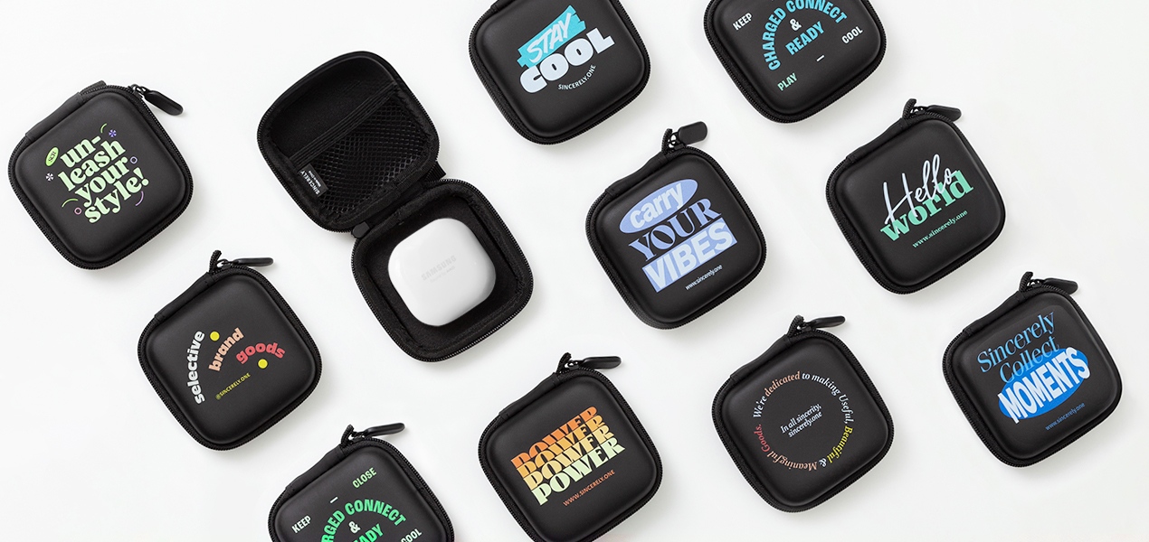 단단한 하드커버 위에 브랜드 그래픽을 풀컬러로 인쇄해보세요. 매트한 블랙 재질의 파우치와 대비되어 더욱 눈에 띄는 굿즈가 될 거예요.