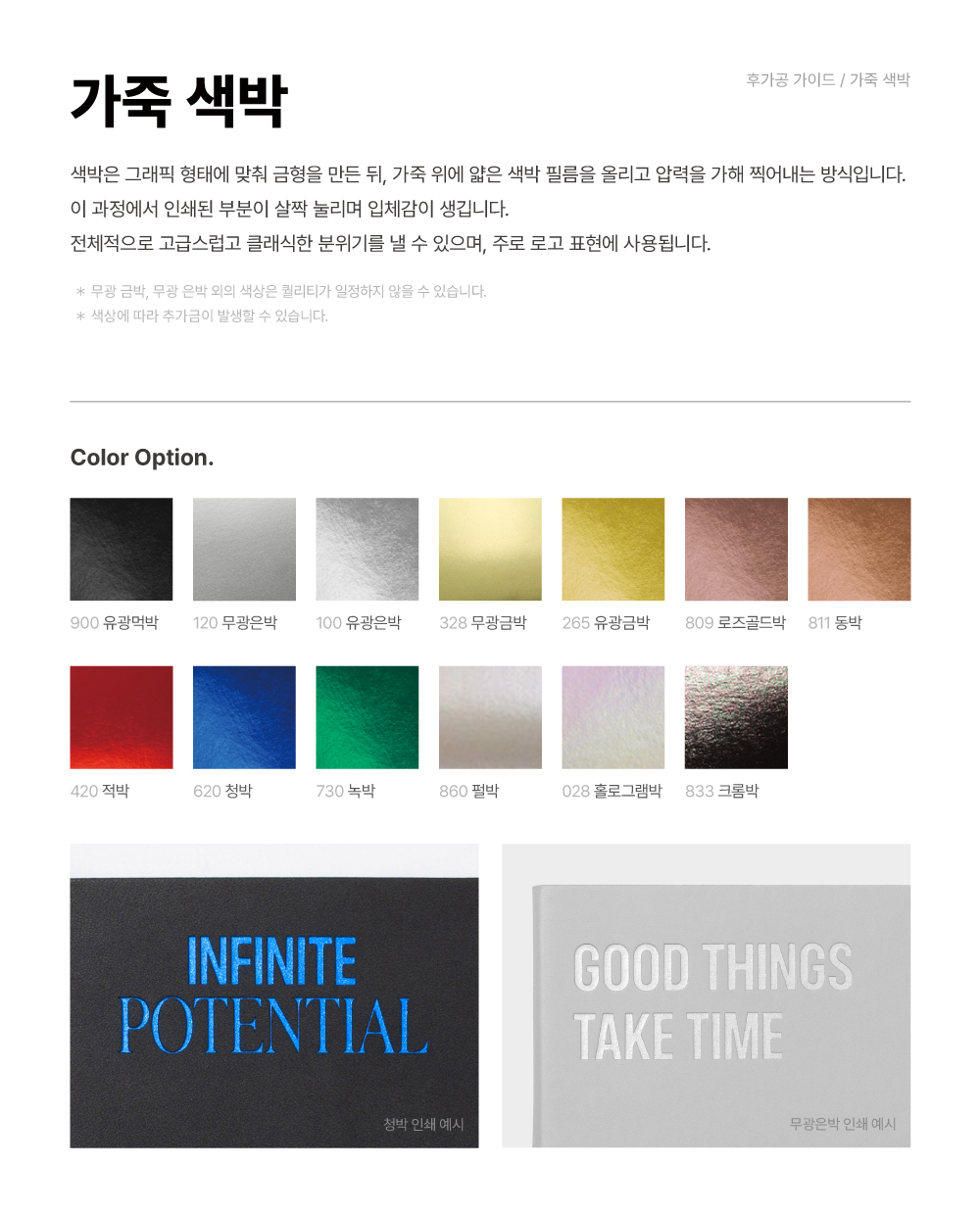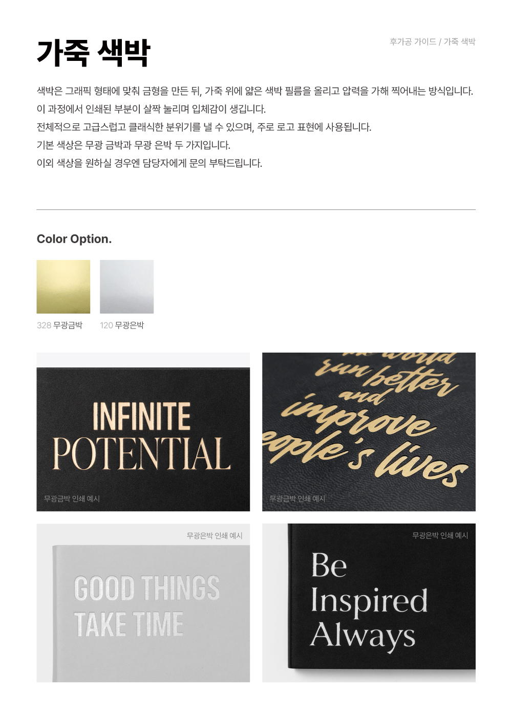 세련된 공박이나 색박(무광은박, 무광금박)으로 브랜드 슬로건을 담아 고급스러운 다이어리를 완성해 보세요.