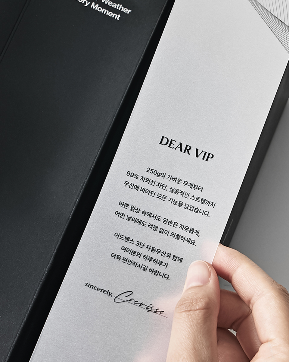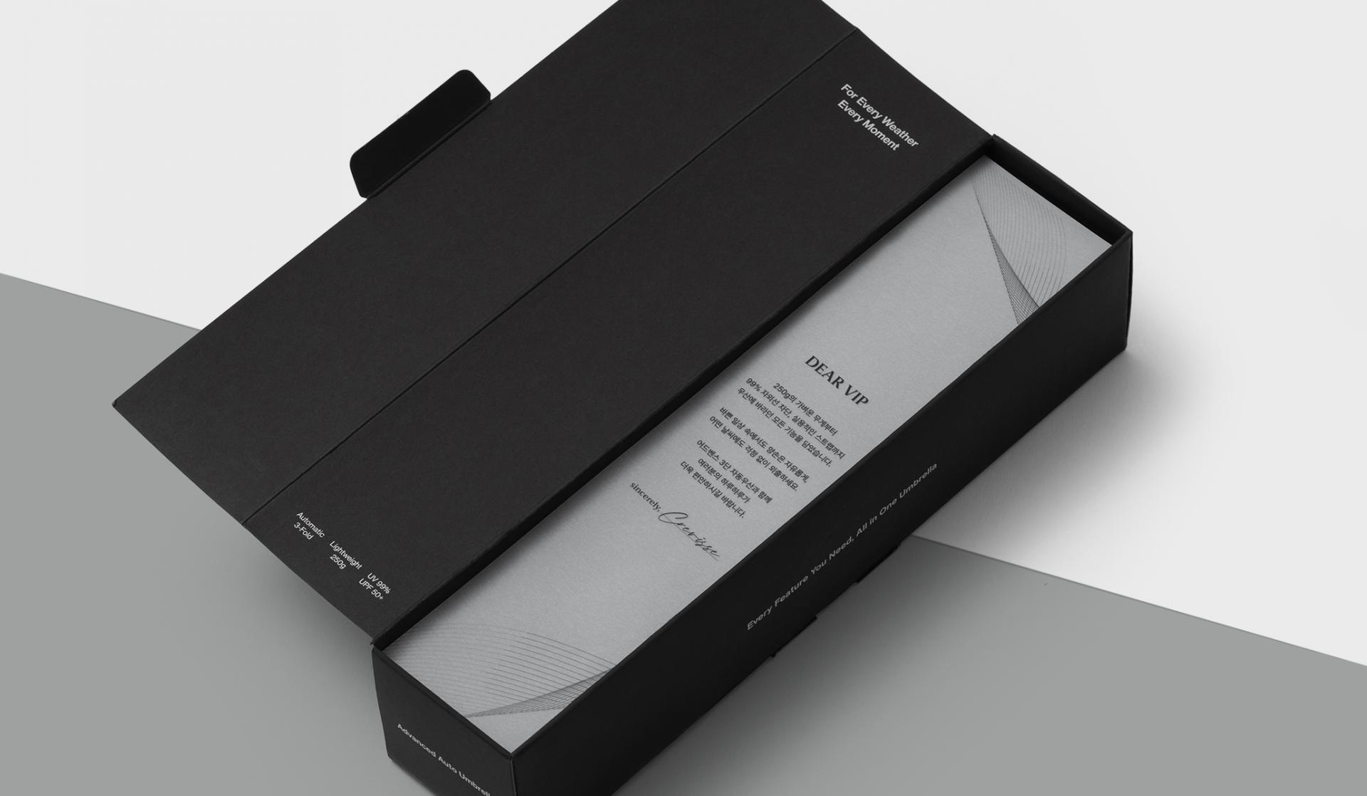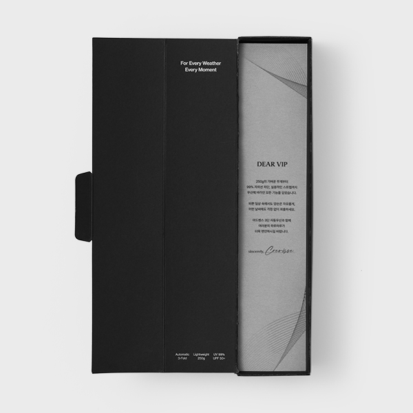 단순한 우산이 아닌, 센스 있는 선물을 완성하는 전용 패키지입니다. 우산이 꼭 맞게 담기는 블랙 박스에 브랜드 메시지를 담은 웰컴페이퍼를 추가해보세요. 공공기관 기념품으로도 파트너사 미팅 선물로도 좋은 고급스러운 굿즈가 될 거예요.