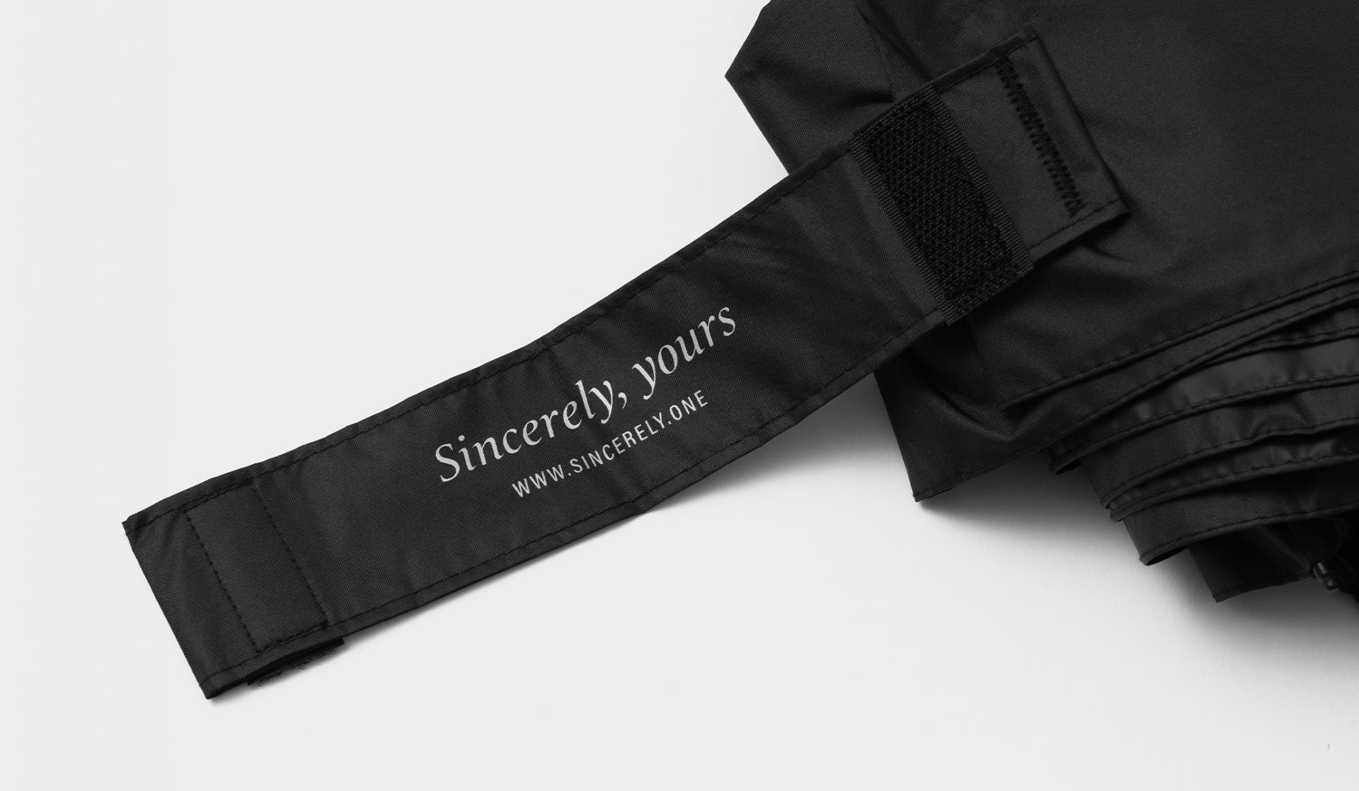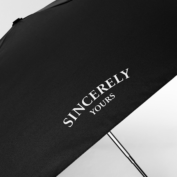 올블랙 우산에 가장 잘 어울리는 실버 컬러로 인쇄할 수 있습니다. 여유로운 길이의 핸드스트랩에 브랜드 로고를 담으면 휴대할 때에도 자연스럽게 브랜딩이 되어 가장 추천드리는 인쇄 옵션입니다. 여밈끈과 원단에도 세련되게 인쇄가 가능합니다.