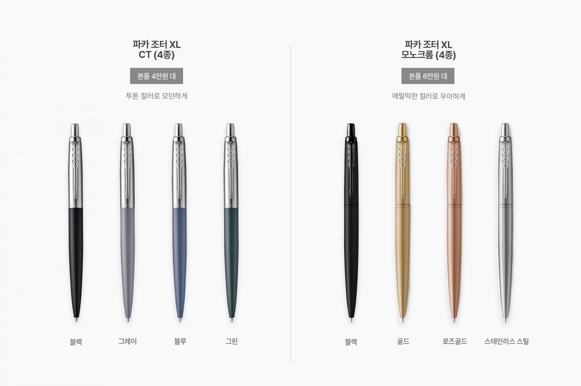 중요한 파트너나 구성원에게 어떤 선물로 마음을 전하고 계신가요? 세대를 넘어 인정받는 필기구 브랜드인 파카는 비즈니스와 약속에 대한 존중을 가장 확실하게 전달합니다. 꾸준한 품질로 전세계 비즈니스 현장에서 신뢰 받는 파카의 대표 볼펜, 조터 XL을 만나보세요.
