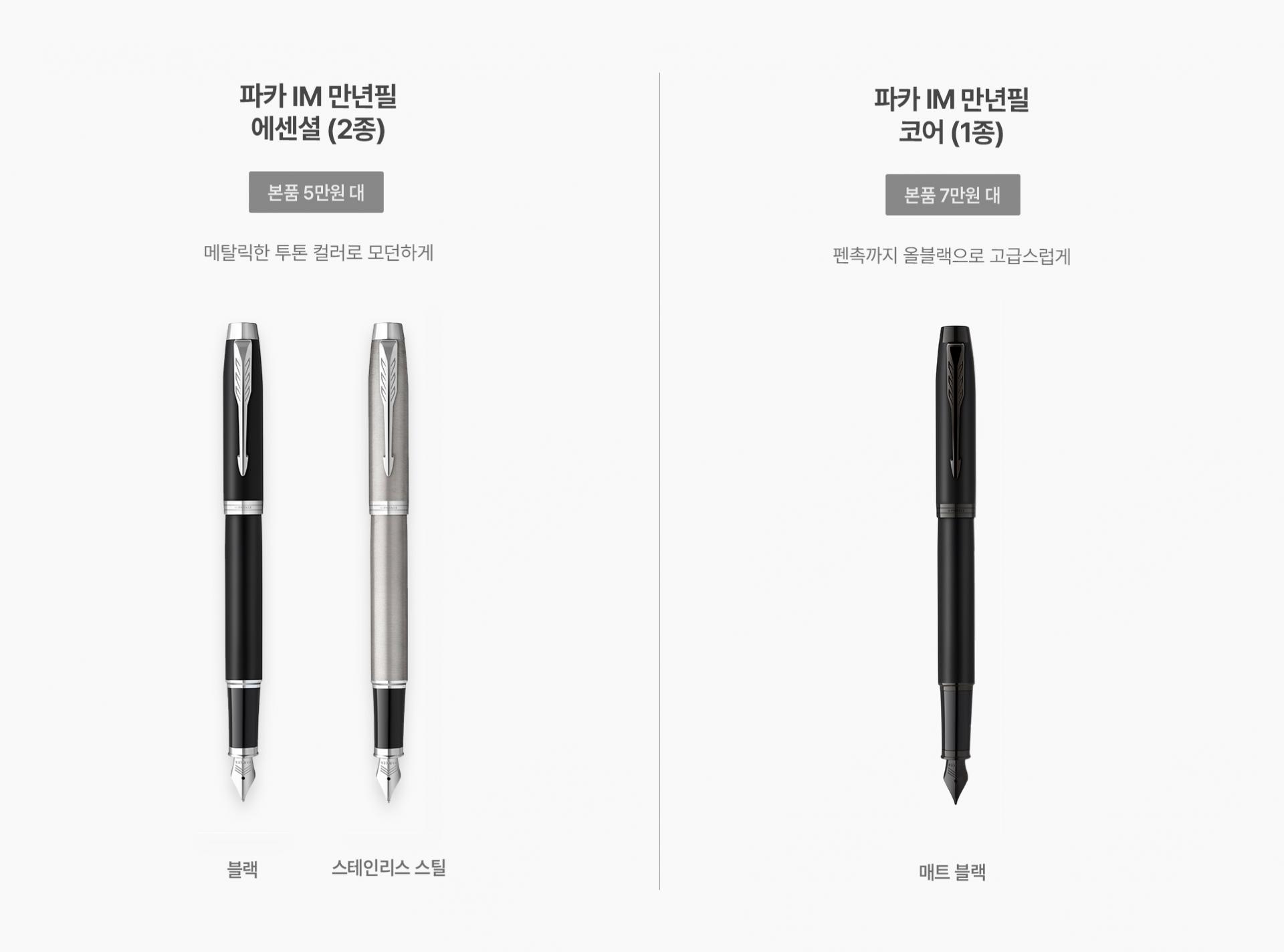 137년의 헤리티지가 느껴지는 IM 만년필을 에센셜과 코어 라인으로 만나보세요. 메탈릭한 2가지 컬러의 에센셜과 고급스러운 올블랙의 코어 중 선택할 수 있습니다. 세대를 넘어 이어진 신뢰를 담아 정품 인증 보증서를 함께 제공해드립니다.