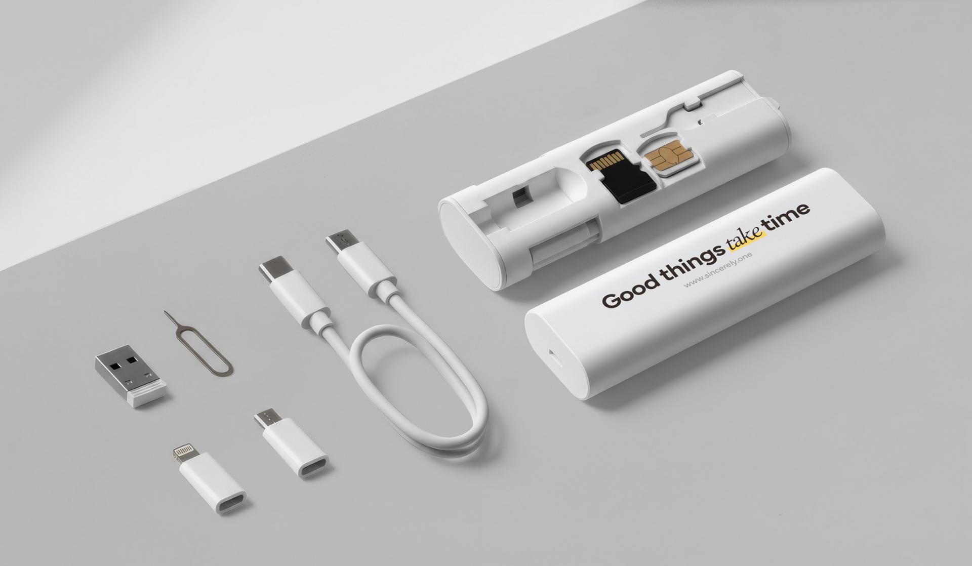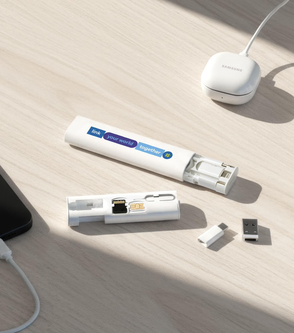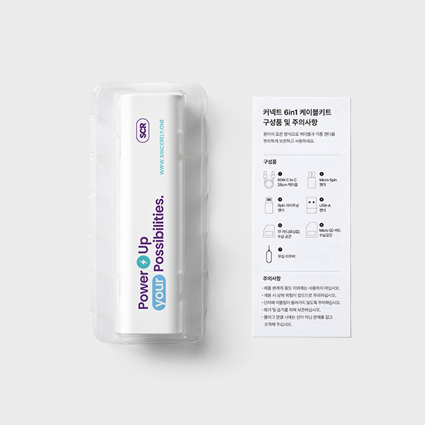 커넥트 케이블 키트는 C타입부터 8핀, 5핀, USB-A까지 모든 스마트 기기를 하나로 연결하고, 60W 고속 충전으로 노트북까지 빠르게 충전합니다. 해외 출장 시 필요한 유심과 SD카드 보관 기능은 세상과의 연결을 지켜주죠.