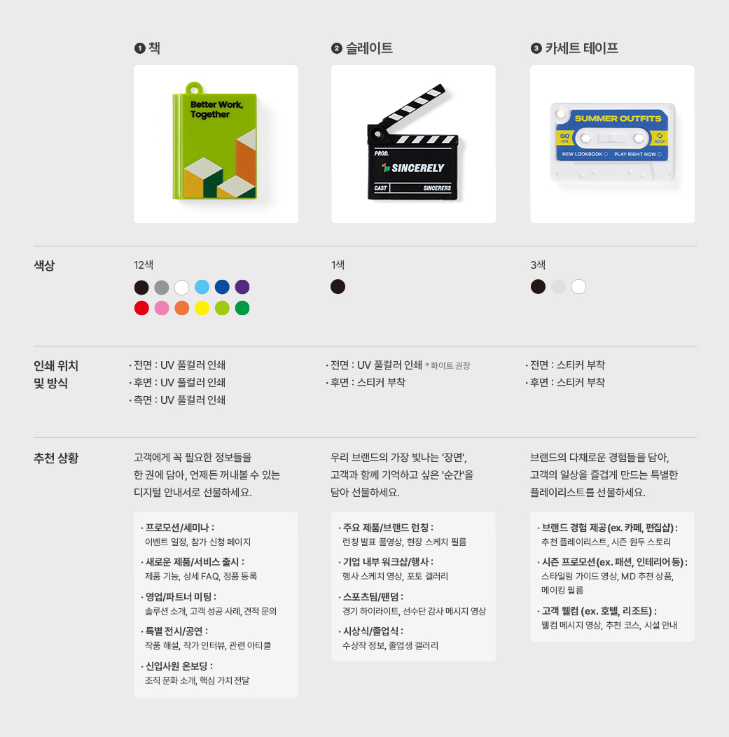 평면적인 화면을 넘어, 손끝으로 기억되는 브랜드 경험을 전해보세요. 손안의 작은 '책'에는 제품 카탈로그나 서비스 소개, 입사 안내서를, '슬레이트'에는 브랜드 영상이나 함께했던 순간의 기록을, '카세트'에는 공유하고 싶은 플레이리스트를 담아보세요.