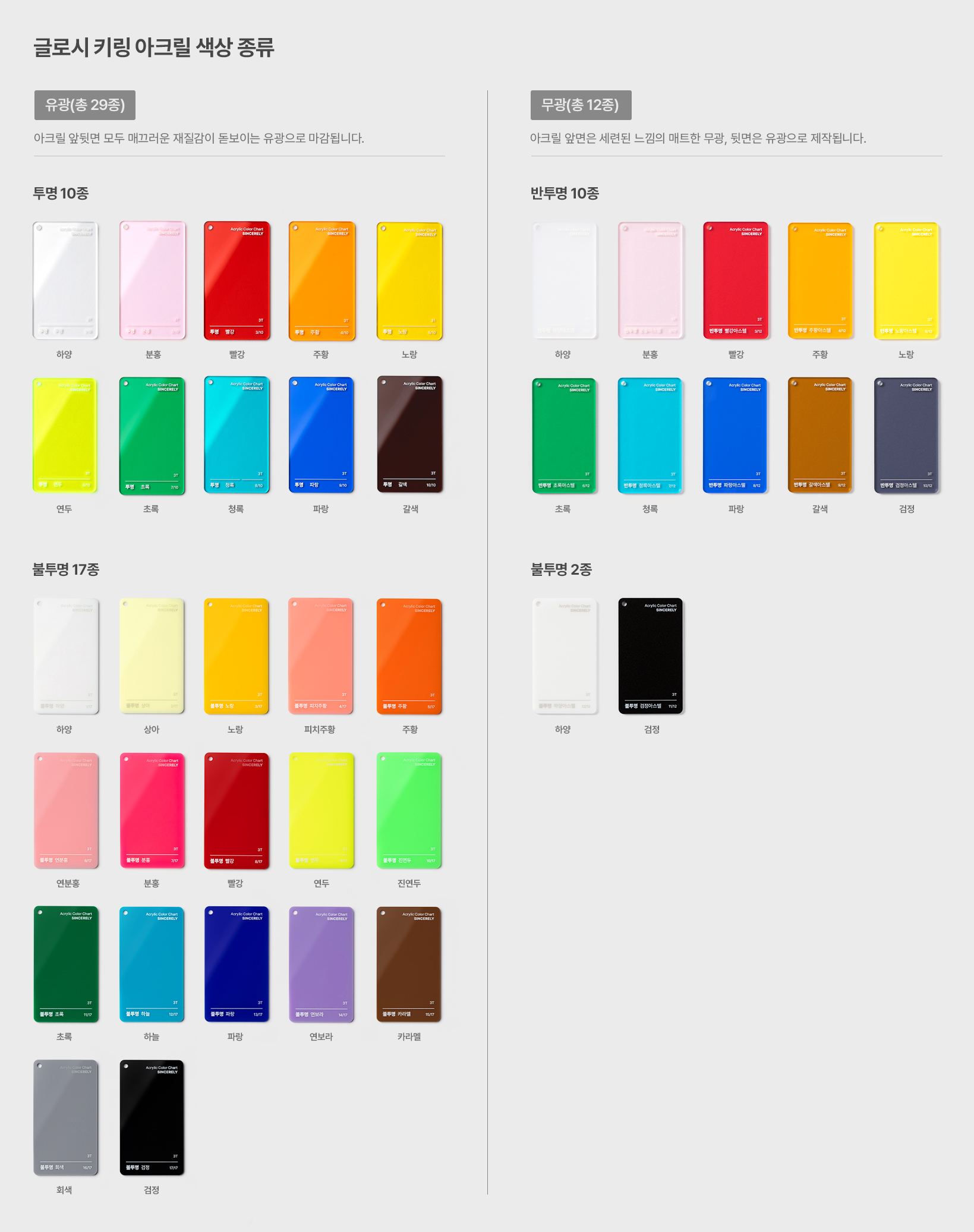 유광 색상은 27종(투명&불투명), 무광 색상은 12종(반투명&불투명) 중에서 선택 가능합니다.