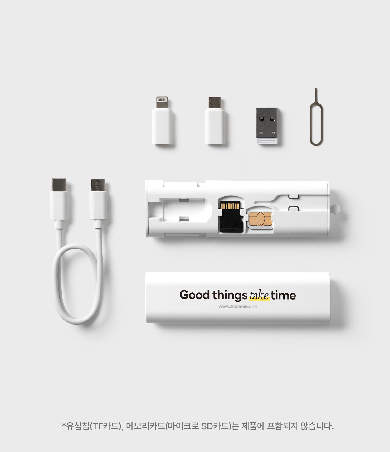 CtoC 케이블과 3가지 젠더(8핀, 5핀, USB-A)로 어떤 기기든 연결·충전해 보세요. 60W 고속 충전으로 노트북도 충전 가능하며, 유심칩과 메모리카드를 보관해 데이터를 보호하실 수 있습니다. 편리한 원터치 케이스에 담아 출장부터 여행까지 가볍게 휴대하세요.