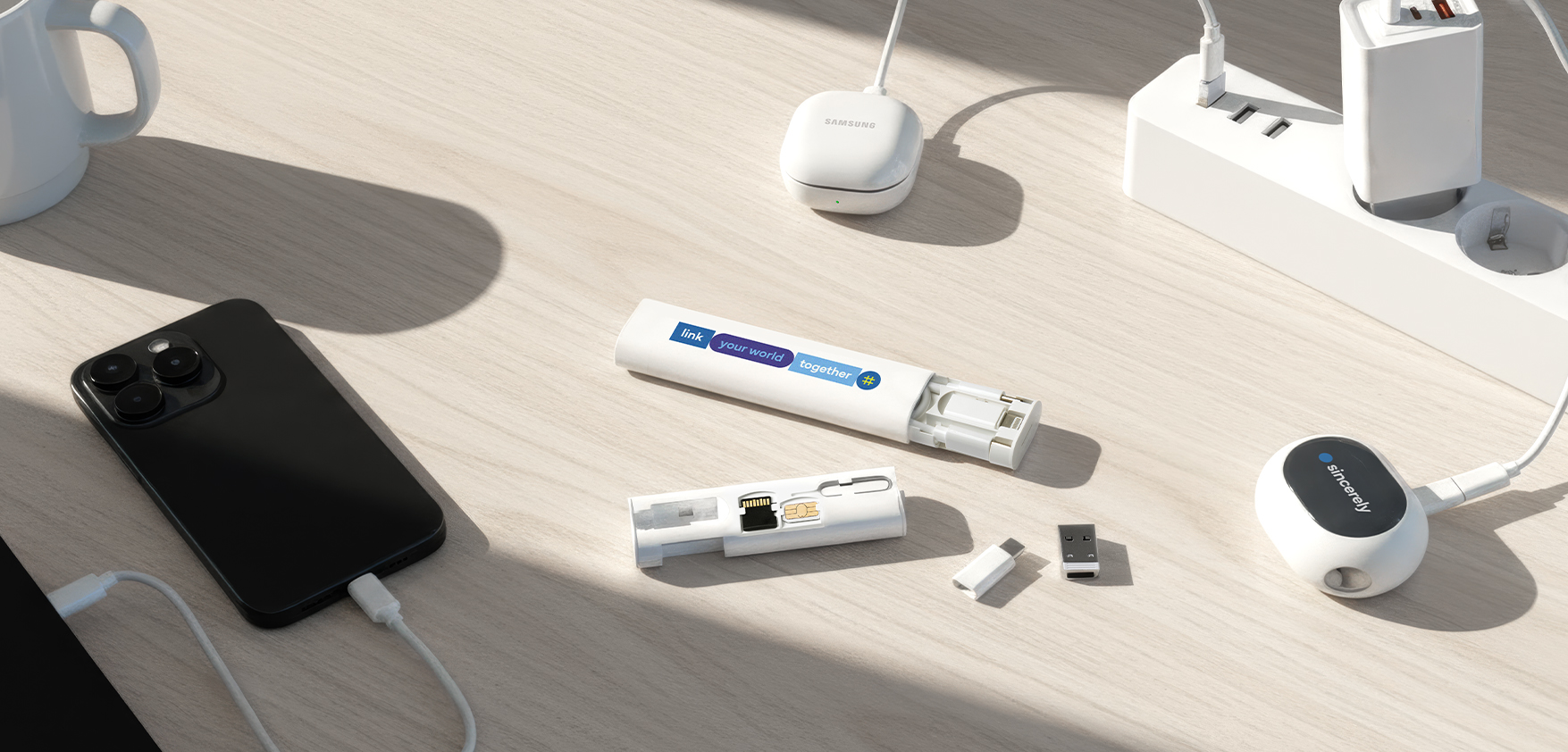 커넥트 케이블 키트는 C타입부터 8핀, 5핀, USB-A까지 모든 스마트 기기를 하나로 연결하고, 60W 고속 충전으로 노트북까지 빠르게 충전합니다. 해외 출장 시 필요한 유심과 SD카드 보관 기능은 세상과의 연결을 지켜주죠.