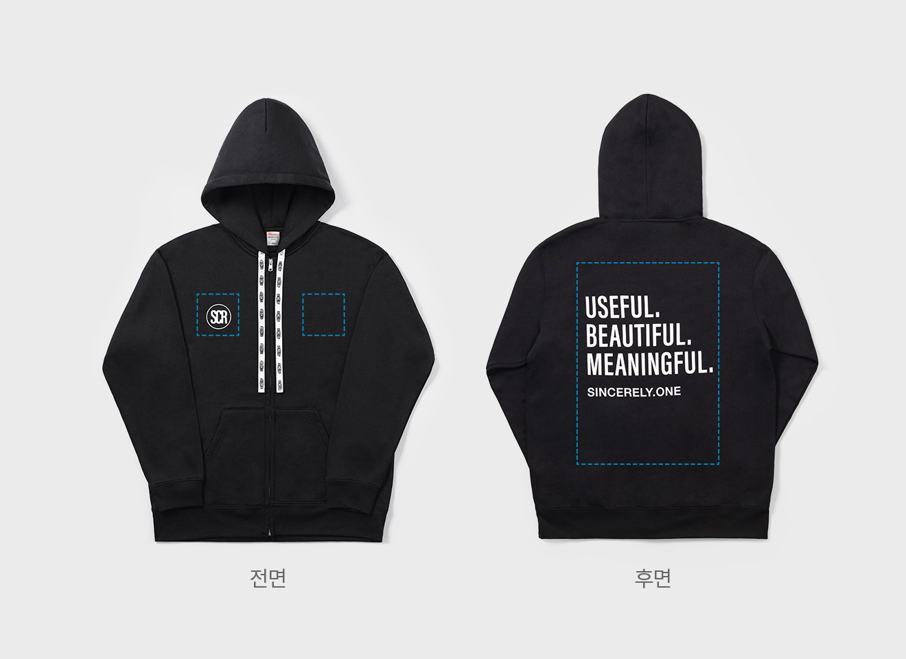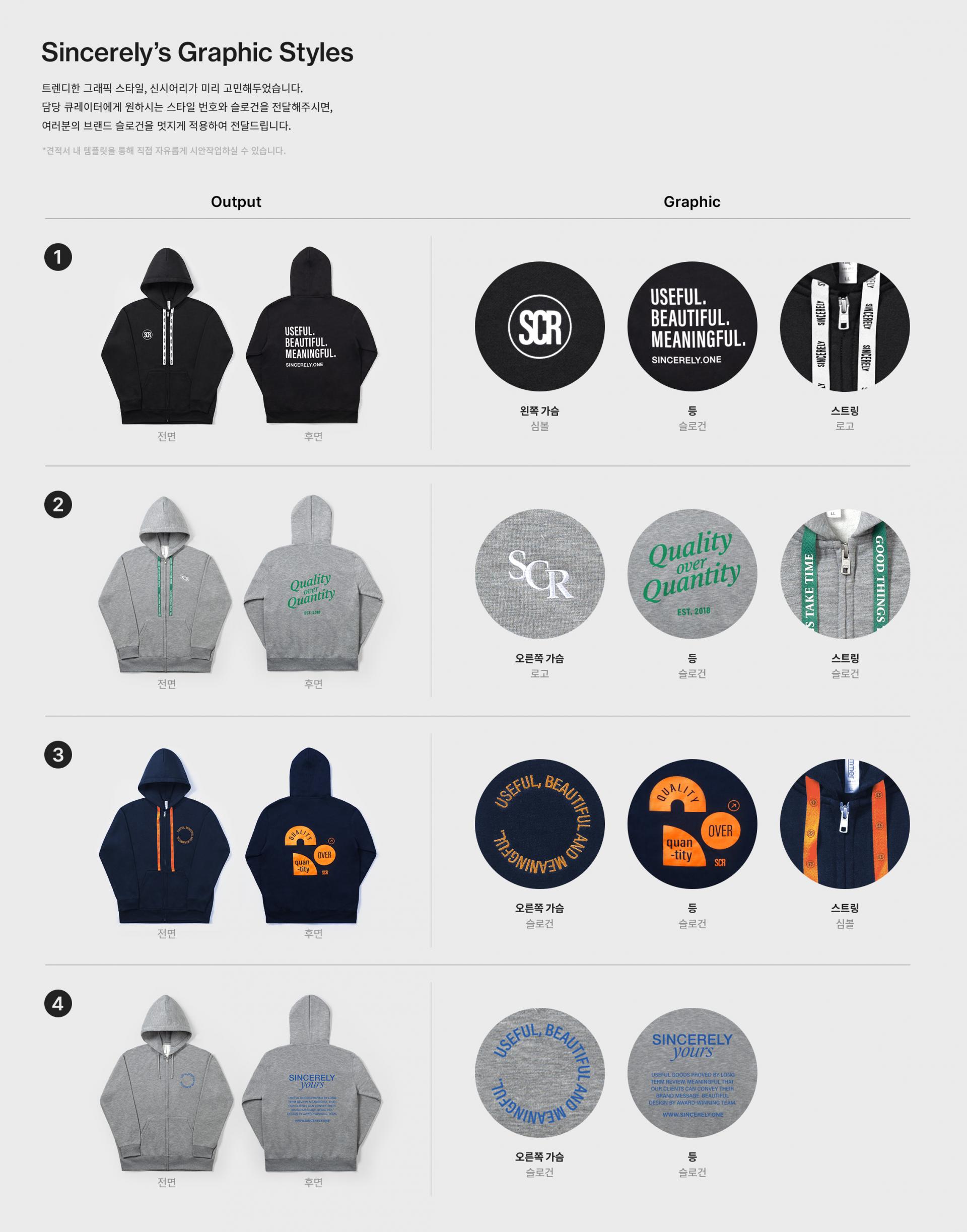 브랜드 로고 - 가슴과 등 그리고 후드 스트링까지 인쇄가 가능합니다. 신시어리 그래픽 리소스(클릭)를 활용하여 원하는 위치에 브랜드를 개성 있게 표현해보세요.