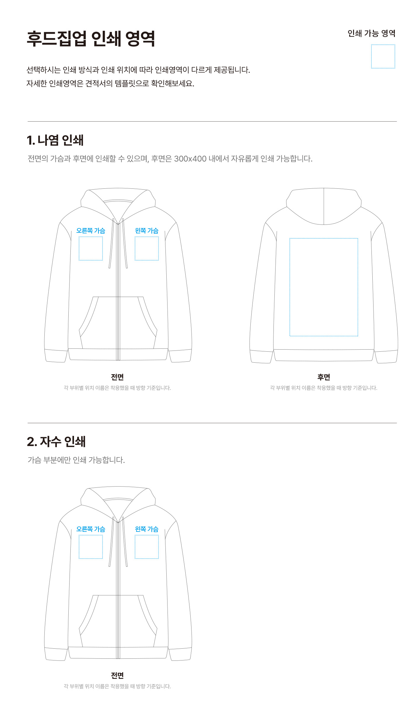 여러 부위에 인쇄하여도 무관하며 인쇄 영역 갯수, 넓이 등에 따라 추가 비용이 발생합니다. 부위에 따라 인쇄가 가능한 최대 크기가 다를 수 있습니다.