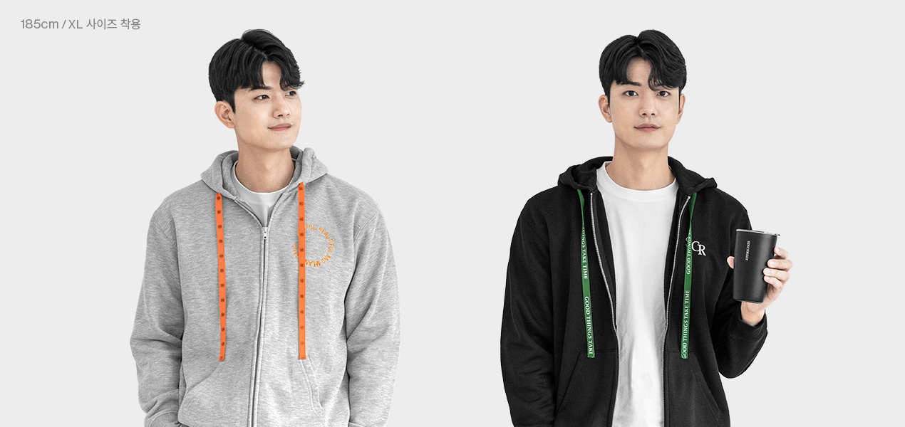 브랜드 슬로건을 - 브랜드 슬로건을 후드 스트링에 인쇄해 보세요. 슬로건이 써져 있는 후드 스트링이 자연스럽게 보이면서 유니크한 후드집업이 완성됩니다.